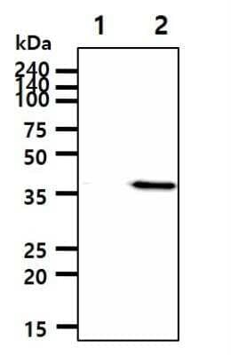 ACAT2 Antibody (55D5) [NBP2-42614] - The cell lysates(5ug) were resolved by SDS-PAGE, transferred to PVDF membrane and probed with anti-human ACAT2 antibody (1:1000). Proteins were visualized using a goat anti-mouse secondary antibody conjugated to HRP and an ECL detection system.Lane 1.: 293T cell lysateLane 2.: ACAT2 Transfected 293T cell lysate