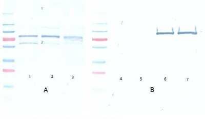 Western Blot: AKT1 [p Ser473] Antibody (17F6.B11) [NBP1-69923] - Western Blot of AKT1 [p Ser473] antibody (17F6.B11). A: Lane 1) PDGF stimulated NIH 3T3 cells [10ul]. Lane 2) NIH 3T3 cells [10ul]. Lane 3) Hela whole cell lysate [10ul] (weak signal). B: Lane 4) GST negative control protein [100ng]. Lane 5) GST negative control protein [25ng]. Lane 6) AKT 1 recombinant protein [100ng]. Lane 7) AKT 1 recombinant protein [25ng].Block: 5% BSA overnight at 4C.Primary antibody: Monoclonal anti-AKT antibody used at 1:1000 for overnight at 4C.Secondary antibody: HRP Conjugated goat anti-mouse 1:25K for 45 min at RT.Detection: TMB for 20 minutes, rinsed with deionized water, dried and scanned on conventional flatbed scanner.