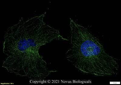 Immunocytochemistry/Immunofluorescence: alpha Tubulin Antibody (DM1A) [Alexa Fluor® 488] [NB100-690AF488] - NIH3T3 cells were fixed in 4% paraformaldehyde for 10 minutes and permeabilized in 0.05% Triton X-100 in PBS for 5 minutes. The cells were incubated with anti-alpha Tubulin Antibody [DM1A] conjugated to Alexa Fluor 488 (NB100-690AF488) at 5 ug/ml for 1 hour at room temperature. Nuclei were counterstained with DAPI (Blue). Cells were imaged using a 100X objective and digitally deconvolved.