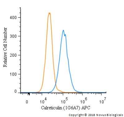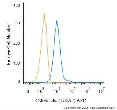 Flow Cytometry: Calreticulin Antibody (1G6A7) [Allophycocyanin] [NBP1-47518APC] - An intracellular stain was performed on U-937 cells with Calreticulin Antibody (1G6A7) NBP1-47518APC (blue) and a matched isotype control (orange). Cells were fixed with 4% PFA and then permeabilized with 0.1% saponin. Cells were incubated in an antibody dilution of 10 ug/mL for 30 minutes at room temperature. Both antibodies were conjugated to Allophycocyanin.