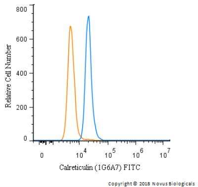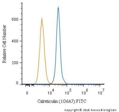 Flow (Intracellular): Calreticulin Antibody (1G6A7) [FITC] [NBP1-47518F] - An intracellular stain was performed on HeLa cells with Calreticulin Antibody (1G6A7) NBP1-47518F (blue) and a matched isotype control (orange). Cells were fixed with 4% PFA and then permeabilized with 0.1% saponin. Cells were incubated in an antibody dilution of 10 ug/mL for 30 minutes at room temperature. Both antibodies were conjugated to FITC.