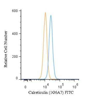 Flow Cytometry: Calreticulin Antibody (1G6A7) [FITC] [NBP1-47518F] - An intracellular stain was performed on U-937 cells with Calreticulin Antibody (1G6A7) NBP1-47518F (blue) and a matched isotype control (orange). Cells were fixed with 4% PFA and then permeabilized with 0.1% saponin. Cells were incubated in an antibody dilution of 5 ug/mL for 30 minutes at room temperature. Both antibodies were conjugated to FITC.