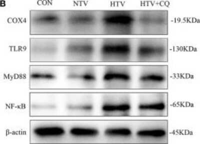 In Western Blot, a band is seen ~19.5 kDa representing COX IV. In ICC/IF, mitochondrion staining was observed in HeLa cells. In IHC-P, staining is observed in the cytoplasm and mitochondria of human breast cancer tissue. Prior to immunostaining paraffin tissues, antigen retrieval with sodium citrate buffer (pH 6.0) is recommended. Higher dilutions may be needed for mitochondrial membrane enriched preparations. In Simple Western only 10 - 15 uL of the recommended dilution is used per data point.