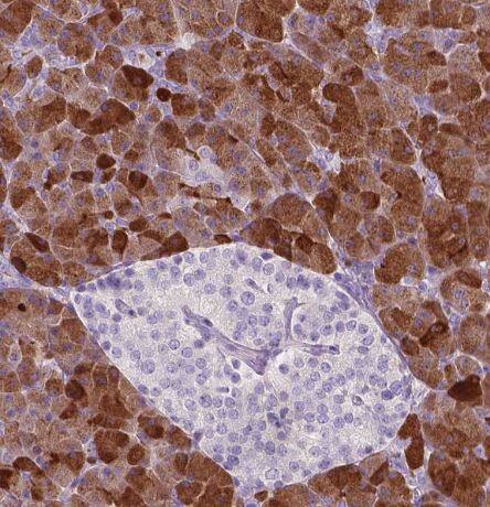 Staining of human pancreas shows strong membranous and cytoplasmic positivity in exocrine glandular cells.Applications for CUZD1 Antibody - BSA Free