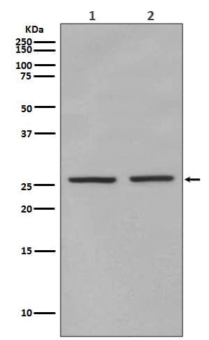 Western Blot: eIF4E [p Ser 209] Antibody (SR1401) [NBP3-21524] - Western blot analysis using NBP3-21524 in (1) HEK293 cell lysate; (2) Mouse spleen lysate.Applications for eIF4E [p Ser209] Antibody (SR1401) - BSA Free