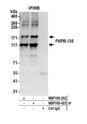 FKBP15 Antibody [NB100-423] - Detection of human FKPB-135 by western blot of immunoprecipitates. Samples: Whole cell lysate (0.5 or 1.0 mg per IP reaction; 20% of IP loaded) from HeLa cells prepared using NETN lysis buffer. Antibody: Affinity purified rabbit anti-FKPB-135 antibody NB100-423 used for IP at 6 ug per reaction. FKPB-135 was also immunoprecipitated by rabbit anti-FKPB-135 antibody NB100-252. For blotting immunoprecipitated FKPB-135, NB100-423 was used at 1 ug/ml. Detection: Chemiluminescence with an exposure time of 3 minutes.