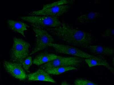 Immunocytochemistry/Immunofluorescence: Glycogen Synthase [p Ser641] Antibody (SR46-06) [NBP2-67315] - Staining Phospho-Glycogen synthase 1(S641) in NIH/3T3 cells (green). The nuclear counter stain is DAPI (blue). Cells were fixed in paraformaldehyde, permeabilised with 0.25% Triton X100/PBS.