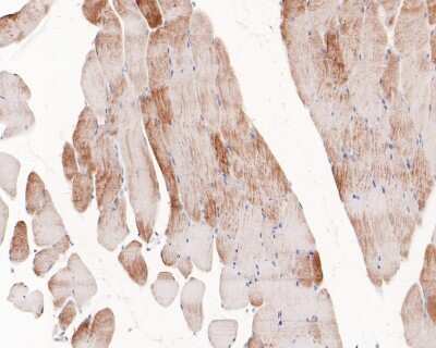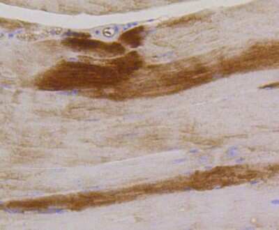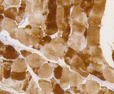 Immunohistochemistry-Paraffin: Glycogen Synthase [p Ser641] Antibody (SR46-06) [NBP2-67315] - Analysis of paraffin-embedded rat skeletal muscle tissue with Rabbit anti-Glycogen synthase [p Ser641] antibody washed with ddH2O and PBS, and then probed with the primary antibody at 1/200 dilution for 1 hour at room temperature. The detection was performed using an HRP conjugated compact polymer system. DAB was used as the chromogen. Tissues were counterstained with hematoxylin and mounted with DPX.