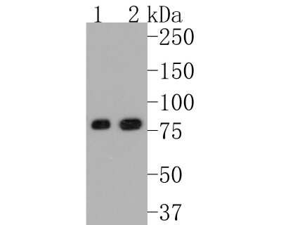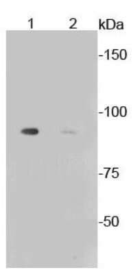 Western Blot: Glycogen Synthase [p Ser641] Antibody (SR46-06) [NBP2-67315] - Analysis of Phospho-Glycogen synthase 1 on HepG2 cell lysates. Lane 1: HepG2 cells, whole cell lysate, 10ug/lane Lane 2: HepG2 cells treated with 2.8ug/ul lambda-PP for 30 minutes, whole cell lysates, 10ug/lane All lanes : Anti-Phospho-Glycogen synthase 1 antibody at 1:500 dilution. Anti-GAPDH antibody at 1:10,000 dilution. Goat Anti-Rabbit IgG H&L (HRP) at 1/200,000 dilution. Predicted band size: 84 kDa Observed band size: 84 kDa Blocking and diluting buffer: 5% BSA.Exposure time: 1 minute 34 seconds