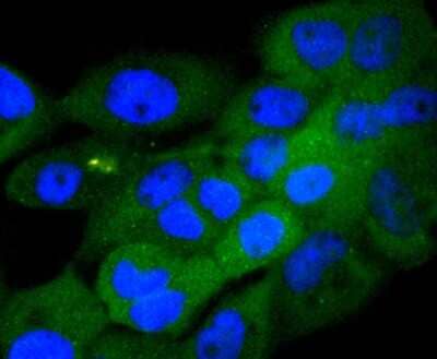 Immunocytochemistry/Immunofluorescence: GSK-3 alpha/beta [p Tyr216, p Tyr279] Antibody (SY26-05) [NBP2-67441] - Staining Phospho-GSK3(alpha+beta)(Y216+Y279) in MCF-7 cells (green). The nuclear counter stain is DAPI (blue). Cells were fixed in paraformaldehyde, permeabilised with 0.25% Triton X100/PBS.