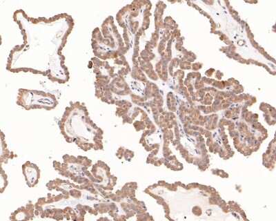 Immunohistochemistry-Paraffin: GSK-3 alpha/beta [p Tyr216, p Tyr279] Antibody (SY26-05) [NBP2-67441] - Analysis of paraffin-embedded human thyroid carcinoma tissue with Rabbit anti-Phospho-GSK3 alpha/beta [p Tyr216, p Tyr279) antibody washed with ddH2O and PBS, and then probed with the primary antibody at 1/800 dilution for 1 hour at room temperature. The detection was performed using an HRP conjugated compact polymer system. DAB was used as the chromogen. Tissues were counterstained with hematoxylin and mounted with DPX.