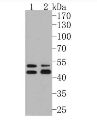 Western Blot: GSK-3 alpha/beta [p Tyr216, p Tyr279] Antibody (SY26-05) [NBP2-67441] - Analysis of GSK-3 alpha/beta [p Tyr216, p Tyr279] on mouse brain tissue lysates with Rabbit anti-GSK-3 alpha/beta [p Tyr216, p Tyr279] antibody at 1:500 dilution. Lysates/proteins at 20 ug/Lane. Predicted band size: 46/51 kDa Observed band size: 46/51 kDa Exposure time: 2 minutes; 10% SDS-PAGE gel. Proteins were transferred to a PVDF membrane and blocked with 5% NFDM/TBST for 1 hour at room temperature. The primary antibody at 1:500 dilution was used in 5% NFDM/TBST at room temperature for 2 hours. Goat Anti-Rabbit IgG - HRP Secondary Antibody at 1:300,000 dilution was used for 1 hour at room temperature.