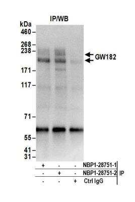 Western Blot: Rabbit Polyclonal GW182 Antibody [NBP1-28751] - Detection of human GW182 by western blot of immunoprecipitates. Samples: Whole cell lysate (50 ug) from HeLa cells. Antibodies: Affinity purified rabbit anti-GW182 antibodyNBP1-28751 (lot NBP1-28751-2) used for IP at 6 ug/mg lysate. GW182 was also immunoprecipitated by a previous lot (lot NBP1-28751-1) of this antibody. For blotting immunoprecipitated GW182, NBP1-28751 was used at 1 ug/ml. Detection: Chemiluminescence with an exposure time of 3 seconds.Applications for GW182 Antibody - BSA Free