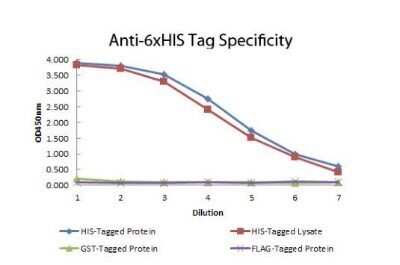 ELISA: His Tag Antibody (33D10.D2.G8) [Biotin] [NBP1-42782] - ELISA of Mouse anti-6xHIS Tag Antibody. Antigen: HIS-tagged purified protein and E. coli cell lysates expressing HIS-Tagged construct, GST- and RON-tagged purified proteins. Coating amount: 0.15 ug per well. Primary antibody: 6xHIS Tag antibody at 100 ug/mL. Dilution series: 2-fold. Mid-point concentration: 200 ng/mL. Secondary antibody: Peroxidase mouse secondary antibody at 1:10,000. Substrate: TMB