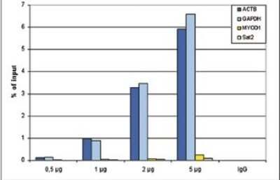 Chromatin Immunoprecipitation: Histone H2B [ac Lys15] Antibody [NBP2-59272] - ChIP assays were performed using human HeLa cells, the antibody against H2BK15ac and optimized PCR primer sets for qPCR. ChIP was performed using sheared chromatin from 1.5 million cells. A titration of the antibody consisting of 0.5, 1, 2 and, 5 ug per ChIP experiment was analysed. IgG (1 ug/IP) was used as negative IP control. QPCR was performed with primers for a region approximately 1 kb upstream of the GAPDH and ACTB promoters, used as positive controls, and for the coding region of the inactive MYOD1 gene and the Sat2 satellite repeat, used as negative controls. Figure shows the recovery, expressed as a % of input (the relative amount of immunoprecipitated DNA compared to input DNA after qPCR analysis).