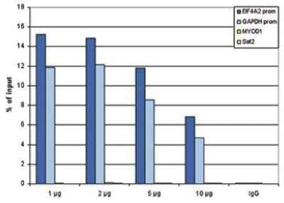 Chromatin Immunoprecipitation: Histone H3 [Trimethyl Lys4] Antibody [NBP2-54610] - Histone 3 [Tryimethyl Lys4] [Trimethyl Lys4] Antibody [NBP2-54610] - ChIP assays were performed using human HeLa cells, the antibody against H3K4me3, and optimized PCR primer pairs for qPCR. Figure shows the recovery, expressed as a percent of input (the relative amount of immunoprecipitated DNA compared to input DNA after qPCR analysis). These results are in accordance with the observation that trimethylation of K4 at histone H3 is associated with the promoters of active genes.