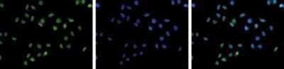 Immunocytochemistry/Immunofluorescence: Histone H3 [Trimethyl Lys36] Antibody [NBP2-54611] - Histone 3 [Trimethyl Lys36] Antibody [NBP2-54611] - HeLa cells were stained with the antibody against H3K36me3 and with DAPI. Cells were fixed with 4% formaldehyde for 10 min. and blocked with PBS/Triton X-100 containing 5% normal goat serum and 1% BSA. The cells were immunofluorescently labeled with the H3K36me3 antibody (left) diluted 1:500 in blocking solution followed by an anti-rabbit antibody conjugated to Alexa Fluor 488. The middle panel shows staining of the nuclei with DAPI. A merge of the two stainings is shown on the right.