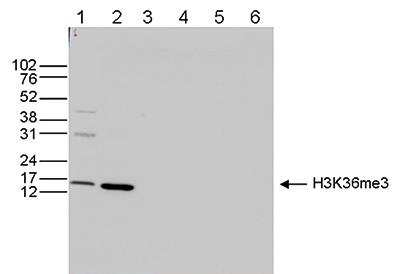 Western Blot: Histone H3 [Trimethyl Lys36] Antibody [NBP2-54611] - Histone 3 [Trimethyl Lys36] Antibody [NBP2-54611] - Western blot was performed on whole cell (25 ug, lane 1) and histone extracts (15 ug, lane 2) from HeLa cells, and on 1 ug of recombinant histone H2A, H2B, H3 and H4 (lane 3, 4, 5 and 6, respectively) using the antibody against H3K36me3. The antibody was diluted 1:1,000 in TBS-Tween containing 5% skimmed milk. Observed molecular weight ~16 kDa.