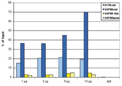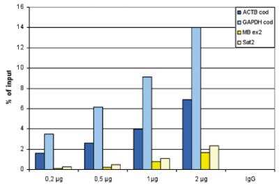 Chromatin Immunoprecipitation Sequencing: Histone H3 [Trimethyl Lys36] Antibody [NBP2-54611] - ChIP assays were performed using human K562 cells, the antibody against H3K36me3 and optimized PCR primer pairs for qPCR. ChIP was performed with a ChIP-seq kit, using sheared chromatin from 100,000 cells. A titration consisting of 0.2, 0.5, 1 and 2 ug of antibody per ChIP experiment was analyzed. IgG (1 ug/IP) was used as a negative IP control. Quantitative PCR was performed with primers for the coding region of the active GAPDH and ACTB genes, used as positive controls, and for the coding region of the inactive MB gene and the Sat satellite repeat, used as negative controls. Figure 1 shows the recovery, expressed as a % of input (the relative amount of immunoprecipitated DNA compared to input DNA after qPCR analysis).