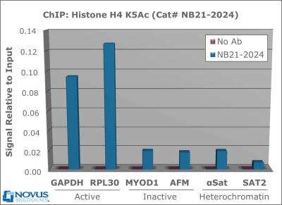 Novus Biologicals Rabbit Histone H4 [ac Lys5] Antibody - BSA Free (NB21-2024) is a polyclonal antibody validated for use in WB, ICC/IF and ChIP. Anti-Histone H4 Antibody: Cited in 3 publications. All Novus Biologicals antibodies are covered by our 100% guarantee.