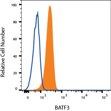 Jurkat cells were stained with Mouse Anti-Human BATF3 Alexa Fluor® 488-conjugated Monoclonal Antibody (Catalog # IC7437G, filled histogram) or isotype control antibody (Catalog # IC0041G, open histogram). To facilitate intracellular staining, cells were fixed and permeabilized with FlowX FoxP3 Fixation & Permeabilization Buffer Kit (Catalog # FC012). View our protocol for Staining Intracellular Molecules.Applications for Human BATF3 Alexa Fluor® 488-conjugated Antibody