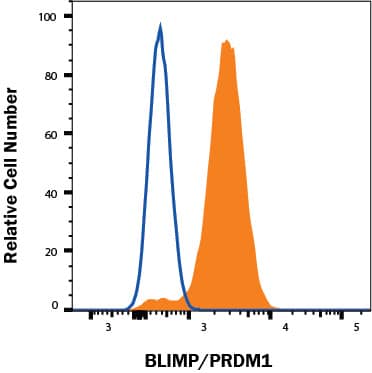 Simple Western lane view shows lysates of U266 human myeloma cell line, loaded at 0.2 mg/mL. A specific band was detected for BLIMP1/PRDM1 at approximately 114 kDa (as indicated) using 10 µg/mL of Mouse Anti-Human BLIMP1/PRDM1 Monoclonal Antibody (Catalog # MAB36081). This experiment was conducted under reducing conditions and using the 12-230 kDa separation system.Detection of BLIMP1/PRDM1 in U266 Human Cell Line by Flow Cytometry.