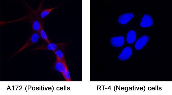 Sample: Immersion fixed IMR32 human neuroblastoma cell line, A172 human glioblastoma cell line (Positive) & RT-4 human urinary bladder transitional cell papilloma cell line (Negative)