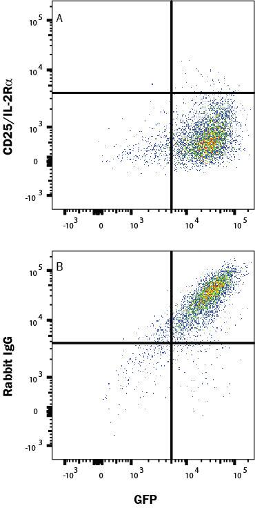 Human PBMCs were treated with Recombinant Human IL-2 (202-IL,20 ng/mL) and TGF-beta (100-B,10 ng/mL) for 24 hours, then stained with (A) Rabbit anti-Human CD25/IL-2 Ra Monoclonal Antibody (Catalog # MAB10203) or (B) Rabbit IgG control antibody (MAB1050), followed by PE-conjugated Anti-Rabbit IgG Secondary Antibody (F0110) and Mouse anti-Human CD3 APC-conjugated Monoclonal Antiobdy (FAB100A). View our protocol for Staining Membrane-associated Proteins.IL-2 binding to Human CD25/IL-2R alpha-transfected HEK293 Human Cell Line is Blocked by Human CD25/IL-2R alpha Antibody.