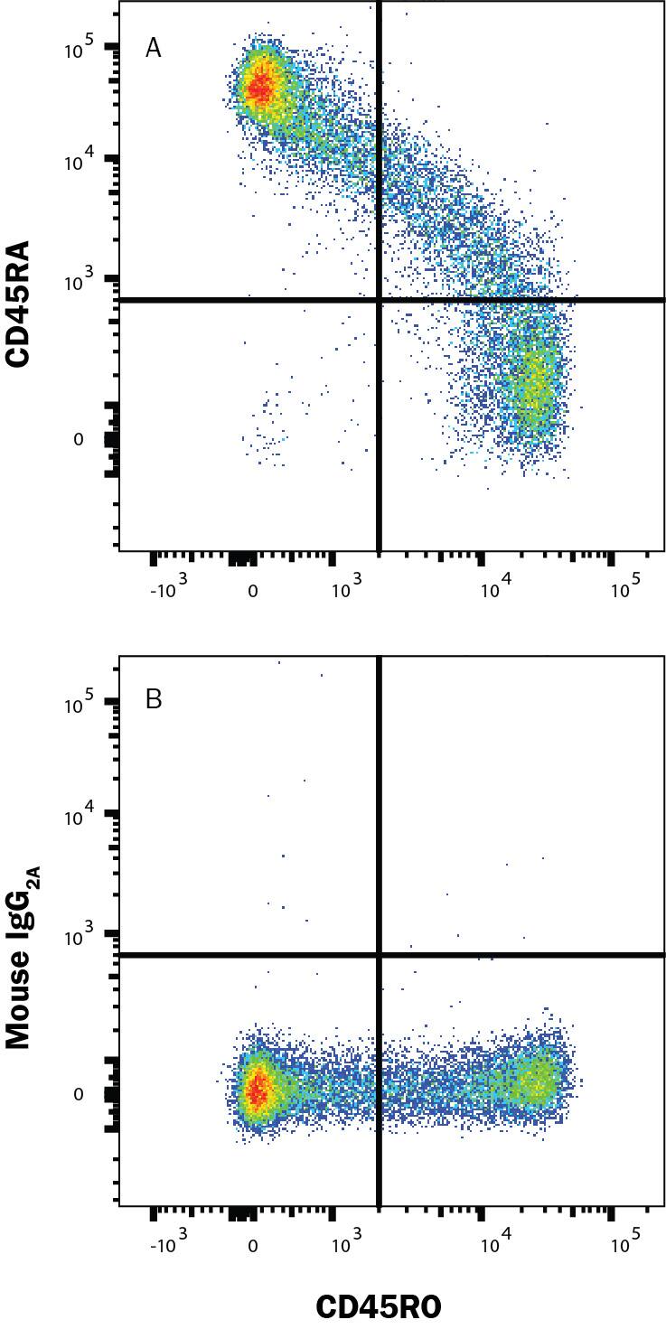 PBMC lymphocytes were stained with either (A) Mouse Anti-Human CD45RA Monoclonal Antibody (Catalog # MAB11444) or (B) Mouse IgG2A Isotype Control (MAB003) followed by Allophycocyanin-conjugated Anti-Mouse IgG Secondary Antibody (F0101B) and followed with Mouse Anti-Human CD45RO Alexa Fluor® 488-conjugated Monoclonal Antibody (FAB10642G). View our protocol for Staining Membrane-associated Proteins.Detection of CD45RA in Human Tonsil.
