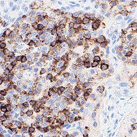 CD45RA was detected in immersion fixed paraffin-embedded sections of Human Tonsil using Mouse Anti-Human CD45RA Monoclonal Antibody (Catalog # MAB11444) at 5 µg/mL for 1 hour at room temperature followed by incubation with the Anti-Mouse IgG VisUCyte™ HRP Polymer Antibody (Catalog # VC001). Before incubation with the primary antibody, tissue was subjected to heat-induced epitope retrieval using VisUCyte Antigen Retrieval Reagent-Basic (Catalog # VCTS021). Tissue was stained using DAB (brown) and counterstained with hematoxylin (blue). Specific staining was localized to cell surface in lymphocytes . View our protocol for IHC Staining with VisUCyte HRP Polymer Detection Reagents.Applications for Human CD45RA Antibody