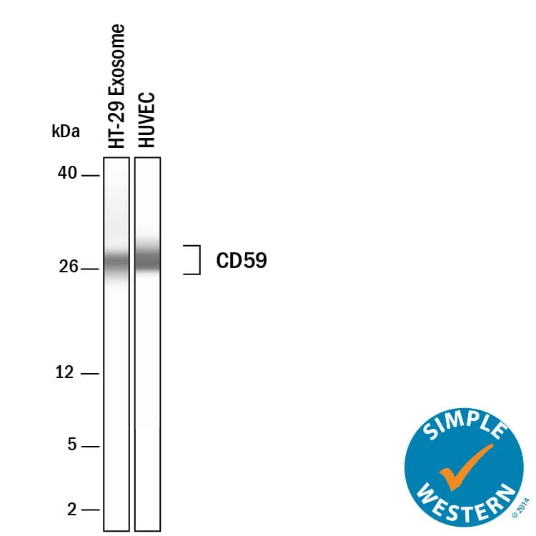 Simple Western lane view shows lysates of Exosome Standards (HT-29) (NBP3-11685) and HUVEC human umbilical vein endothelial cells, loaded at 0.5 mg/ml. A specific band was detected for CD59 at approximately 27-33 kDa (as indicated) using 50 µg/ml of Goat Anti-Human CD59 Antigen Affinity-purified Polyclonal Antibody (Catalog # AF1987) followed by 1:50 dilution of HRP-conjugated Donkey Anti-Goat Secondary Antibody (Catalog # 042-206). This experiment was conducted under reducing conditions and using the 2-40kDa separation system.