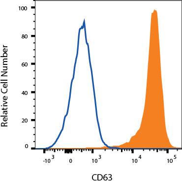 PBMC monocytes were stained with Rabbit Anti-Human CD63 Monoclonal Antibody (Catalog # MAB50481, filled histogram) or isotype control antibody (Catalog # MAB1050, open histogram) followed by Phycoerythrin-conjugated Anti-Rabbit IgG Secondary Antibody (Catalog # F0110). View our protocol for Staining Membrane-associated Proteins.Applications for Human CD63 Antibody