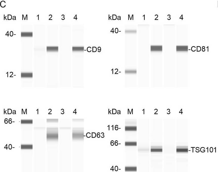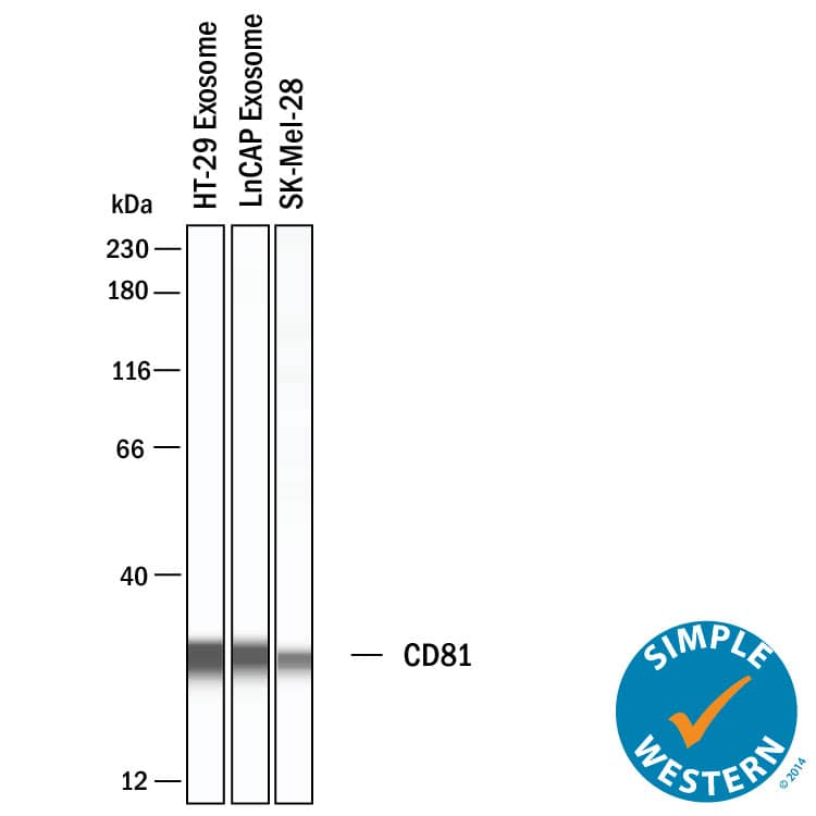 Simple Western shows lysates of Exosome Standards (HT-29) (NBP3-11685), Exosome Standards (LNCaP) (NBP3-11687) and SK-Mel-28 human malignant melanoma cell line, loaded at 0.5 mg/ml. A specific band was detected for CD81 at approximately 29 kDa (as indicated) using 20 µg/mL of Rabbit Anti-Human CD81 Monoclonal Antibody (Catalog # MAB46152). This experiment was conducted under reducing conditions and using the 12-230 kDa separation system.Detection of Human CD81 by Simple WesternTM.