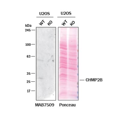Western blot shows lysates of U2OS human osteosarcoma cell line and CHMP2B knockout U2OS cell line (KO). Nitrocellulose membrane was probed with 1.25 µg/mL of Mouse Anti-Human CHMP2B Monoclonal Antibody (Catalog # MAB7509) followed by HRP-conjugated Anti-Mouse IgG Secondary Antibody. A specific band was detected for CHMP2B at approximately 28 kDa (as indicated) in the parental U2OS cell line, but is not detectable in knockout U2OS cell line. The Ponceau stained transfer of the blot is shown. This experiment was conducted under reducing conditions. Image, protocol, and testing courtesy of YCharOS Inc. See ycharos.com for additional details.Applications for Human CHMP2B Antibody