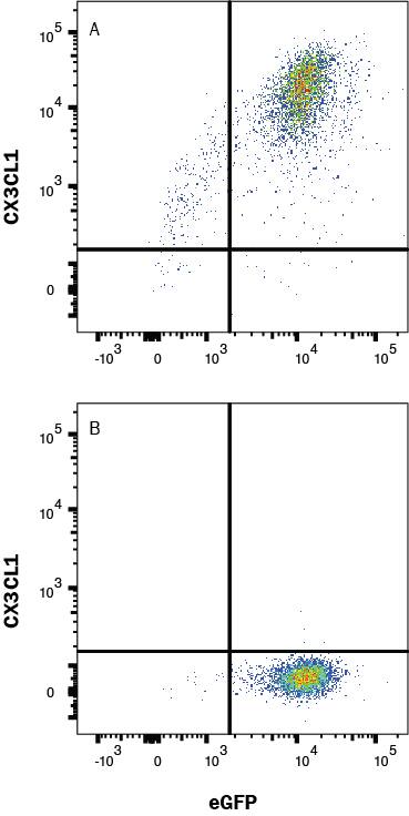 HEK293 cells transfected with hCX3CL1 (A) vs Irrelevant HEK293 transfectant cells (B) were stained with Mouse Anti-Human CX3CL1/Fractalkine Chemokine Domain Monoclonal Antibody (Catalog # MAB3652R) and eGFP isotype control antibody (Catalog # MAB002) followed by Allophycocyanin-conjugated Anti-Mouse IgG Secondary Antibody (Catalog # F0101B). View our protocol for Staining Membrane-associated Proteins.Chemotaxis Induced by CX3CL1/Fractalkine and Neutralization by Human CX3CL1/Fractalkine Antibody.