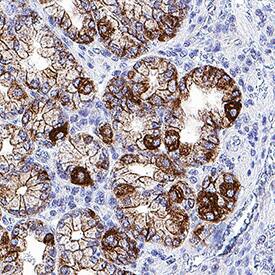 CXCL17/VCC-1 was detected in immersion fixed paraffin-embedded sections of human stomach using Mouse Anti-Human CXCL17/VCC-1 Monoclonal Antibody (Catalog # MAB42071) at 5 µg/mL for 1 hour at room temperature followed by incubation with the Anti-Mouse IgG VisUCyte™ HRP Polymer Antibody (VC001). Before incubation with the primary antibody, tissue was subjected to heat-induced epitope retrieval using Antigen Retrieval Reagent-Basic (CTS013). Tissue was stained using DAB (brown) and counterstained with hematoxylin (blue). Specific staining was localized to cell surface and cytoplasm in gastric glands. Staining was performed using our protocol for IHC Staining with VisUCyte HRP Polymer Detection Reagents.