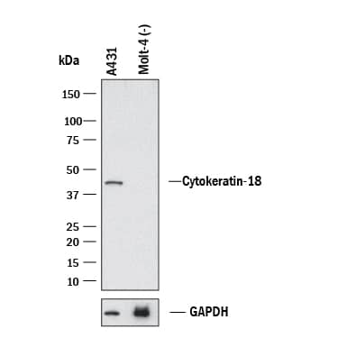 Western blot shows lysates of HeLa human cervical epithelial carcinoma cell line and A431 human epithelial carcinoma cell line. PVDF membrane was probed with 0.2 µg/mL of Mouse Anti-Human Cytokeratin 18 Monoclonal Antibody (Catalog # MAB7619) followed by HRP-conjugated Anti-Mouse IgG Secondary Antibody (Catalog # HAF018). A specific band was detected for Cytokeratin 18 at approximately 48 kDa (as indicated). This experiment was conducted under reducing conditions and using Immunoblot Buffer Group 1.Detection of Human Cytokeratin 18 by Western Blot.