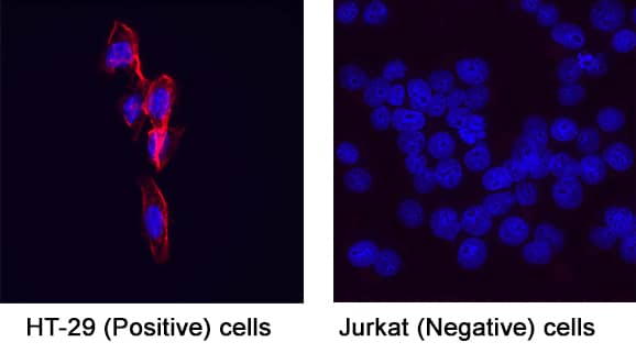 Epithelial Cellular Adhesion Molecule (EpCAM), also known as KS1/4, gp40, GA733-2, 17-1A, and TROP-1, is a 40 kDa transmembrane glycoprotein composed of a 242 amino acid (aa) extracellular domain with two epidermal-growth-factor-like (EGF-like) repeats within the cysteine-rich N-terminal region, a 23 aa transmembrane domain, and a 26 aa cytoplasmic domain. Human and mouse EpCAM share 82% aa sequence identity. In human, EpCAM also shares 49% aa sequence homology with TROP-2/EGP-1. During embryonic development, EpCAM is detected in fetal lung, kidney, liver, pancreas, skin, and germ cells. In adults, human EpCAM is detected in basolateral cell membranes of all simple, pseudo-stratified, and transitional epithelia, but is not detected in normal squamous stratified epithelia, mesenchymal tissue, muscular tissue, neuro-endocrine tissue, or lymphoid tissue (1). EpCAM expression has been found to increase in actively proliferating epithelia tissues and during adult liver regeneration (1, 2). EpCAM expression is also found to increase in human malignant neoplasias, with most carcinoma expressing EpCAM including those of arising from squamous epithelia (1). EpCAM has been shown function as a homophilic Ca2+ independent adhesion molecule (3). Homophilic adhesion via EpCAM requires the interaction of both EGF-like repeats, with the first EGF-like repeat mediating reciprocal interaction between EpCAM molecules on opposing cells, while the second repeat is involved in lateral interaction of EpCAM. Lateral interaction of EpCAM lead to the formation of dimers and tetramers (4). During homophilic adhesion the cytoplasmic tail of EpCAM interacts with the actin cytoskeleton via a direct association alpha-actinin (5).
