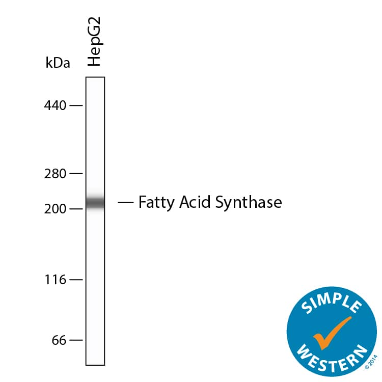 Simple Western shows lysates of HepG2 human hepatocellular carcinoma cell line, loaded at 0.5 mg/ml. A specific band was detected for Fatty Acid Synthase/FASN at approximately 213 kDa (as indicated) using 20 µg/mL of Mouse Anti-Human Fatty Acid Synthase/FASN Monoclonal Antibody (Catalog # MAB59271). This experiment was conducted under reducing conditions and using the 66-440kDa separation system.Applications for Human Fatty Acid Synthase/FASN Antibody