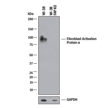 Fibroblast Activation Protein  alpha/FAP is specifically detected in WI‑38 human lung fibroblast parental cell line but is not detectable in Fibroblast Activation Protein  alpha/FAP knockout WI‑38 human lung fibroblast cell line.