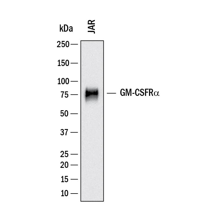 Western blot shows lysates of JAR human choriocarcinoma cells. PVDF membrane was probed with 2 µg/mL of Mouse Anti-Human GM-CSF R alpha Monoclonal Antibody (Catalog # MAB7062) followed by HRP-conjugated Anti-Mouse IgG Secondary Antibody (Catalog # HAF018). A specific band was detected for GM-CSF R alpha at approximately 80 kDa (as indicated). This experiment was conducted under reducing conditions and using Western Blot Buffer Group 1.Applications for Human GM-CSF R alpha Antibody