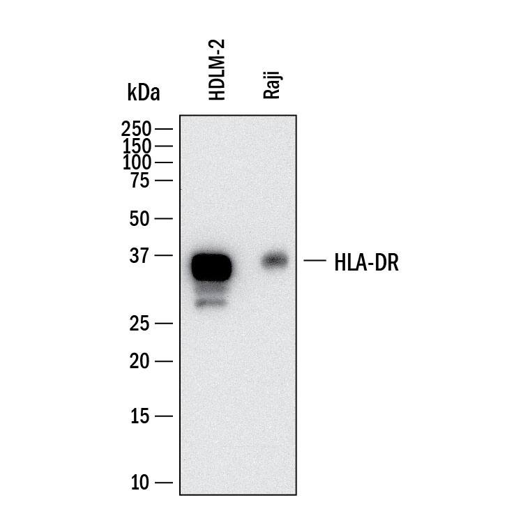 Western Blot shows lysates of HDLM-2 human Hodgkin’s lymphoma cell line and Raji human Burkitt's lymphoma cell line. PVDF membrane was probed with 2 µg/ml of Mouse Anti-Human HLA-DR Monoclonal Antibody (Catalog # MAB11555) followed by HRP-conjugated Anti-Mouse IgG Secondary Antibody (Catalog # HAF018). A specific band was detected for HLA-DR at approximately 35 kDa (as indicated). This experiment was conducted under reducing conditions and using Western Blot Buffer Group 1.