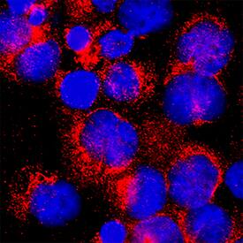 HTRA2/Omi was detected in immersion fixed K562 human chronic myelogenous leukemia cell line using Mouse Anti-Human HTRA2/Omi Monoclonal Antibody (Catalog # MAB1458) at 25 µg/mL for 3 hours at room temperature. Cells were stained using the NorthernLights™ 557-conjugated Anti-Mouse IgG Secondary Antibody (red; NL007) and counterstained with DAPI (blue). Specific staining was localized to cytoplasm. Staining was performed using our protocol for Fluorescent ICC Staining of Non-adherent Cells.Applications for Human HTRA2/Omi Antibody