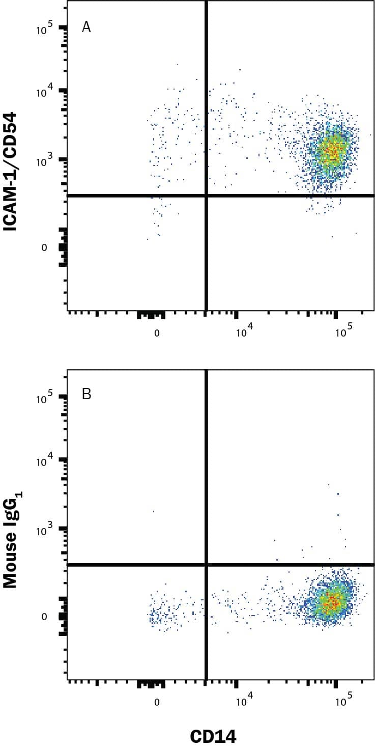 Human peripheral blood mononuclear cells (PBMCs) were stained with (A) Mouse Anti-Human ICAM-1/CD54 Monoclonal Antibody (Catalog # BBA3) or (B) Mouse IgG1 Isotype Control (MAB002) followed by anti-Mouse IgG PE-conjugated Secondary Antibody (F0102B) and Mouse Anti-Human CD14 APC-conjugated Monoclonal Antibody (FAB3832A). Staining was performed using our Staining Membrane-associated Proteins protocol.Detection of Human ICAM-1/CD54 by Western Blot.