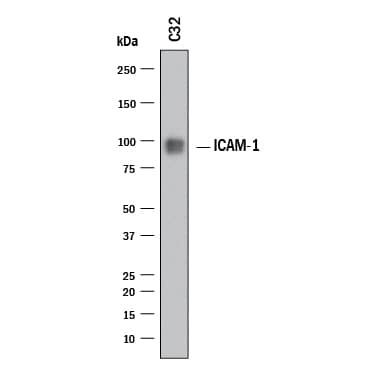 Western blot shows lysates of C32. PVDF membrane was probed with 2 µg/mL of Mouse Anti-Human ICAM-1/CD54 Monoclonal Antibody (Catalog # BBA3) followed by HRP-conjugated Anti-Mouse IgG Secondary Antibody (Catalog # HAF018). A specific band was detected for ICAM-1/CD54 at approximately 85 kDa (as indicated). This experiment was conducted under non-reducing conditions and using Western Blot Buffer Group 1.Applications for Human ICAM-1/CD54 Antibody