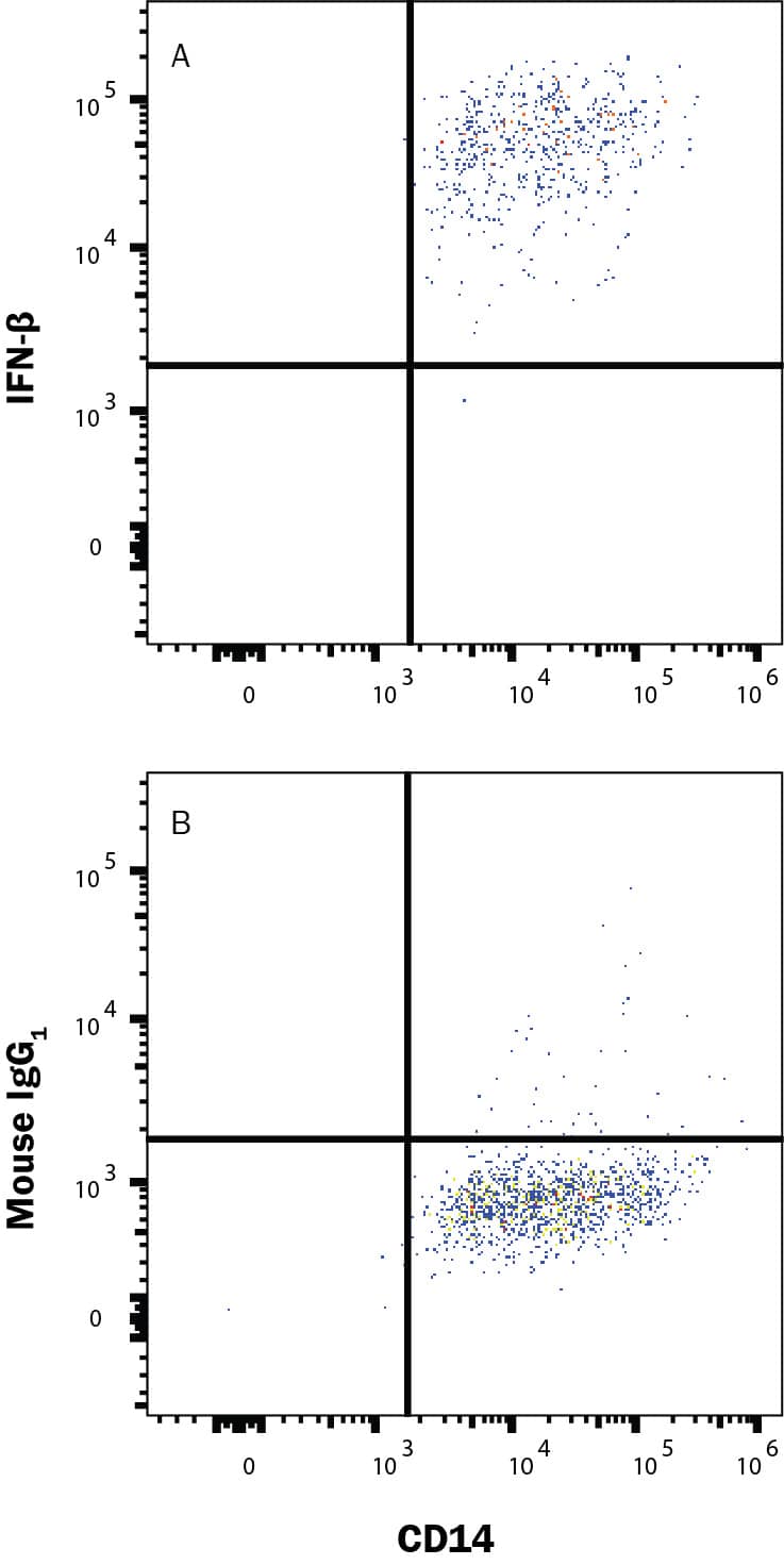M1 macrophages treated with 50 ng/mL each of rhGM-CSF (215-GM) for 6 days followed by an overnight polarization with IFNg and LPS (285-IF) and restimulated with monensin for 3 hours (3uM) were stained with Mouse Anti-Human CD14 PE-conjugated Monoclonal Antibody (Catalog # FAB3832P) and either (A) Mouse Anti-Human IFN-beta Monoclonal Antibody (Catalog # MAB814) or (B) Mouse IgG1 Isotype Control (Catalog # MAB002) followed by Allophycocyanin-conjugated Anti-Mouse IgG Secondary Antibody (Catalog # F0101B). View our protocol for Staining Intracellular Molecules.Applications for Human IFN-beta Antibody