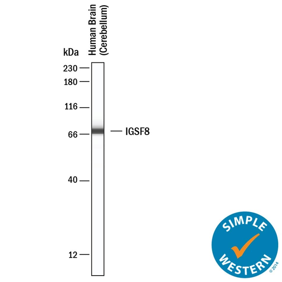 Simple Western lane view shows lysates of Human Brain (Cerebellum), loaded at 0.2 mg/mL. A specific band was detected for IGSF8/CD316 at approximately 73 kDa (as indicated) using 20 µg/mL of Rabbit Anti-Human IGSF8/CD316 Monoclonal Antibody (Catalog # MAB3117) . This experiment was conducted under reducing conditions and using the 12-230 kDa separation system.Applications for Human IGSF8/CD316 Antibody