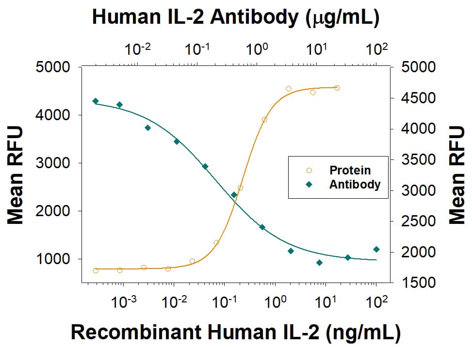 Recombinant Human IL-2 (202-IL) stimulates proliferation in the CTLL-2 mouse cytotoxic T cell line in a dose-dependent manner (orange line) as measured by Resazurin (AR002). Proliferation elicited by Recombinant Human IL-2 (2 ng/mL) is neutralized (green line) by increasing concentrations of Mouse Anti-Human IL-2 Monoclonal Antibody (Catalog # MAB10442). The ND50 is typically 0.05-0.5 µg/mL.Applications for Human IL-2 Antibody