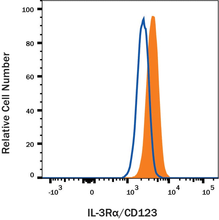 THP-1 cells were stained with Mouse Anti-Human IL-3R alpha/CD123 PerCP-conjugated Monoclonal Antibody (Catalog # FAB301C, filled histogram) or isotype control antibody (Catalog # IC002C, open histogram). View our protocol for Staining Membrane-associated Proteins.Applications for Human IL-3R alpha/CD123 PerCP-conjugated Antibody