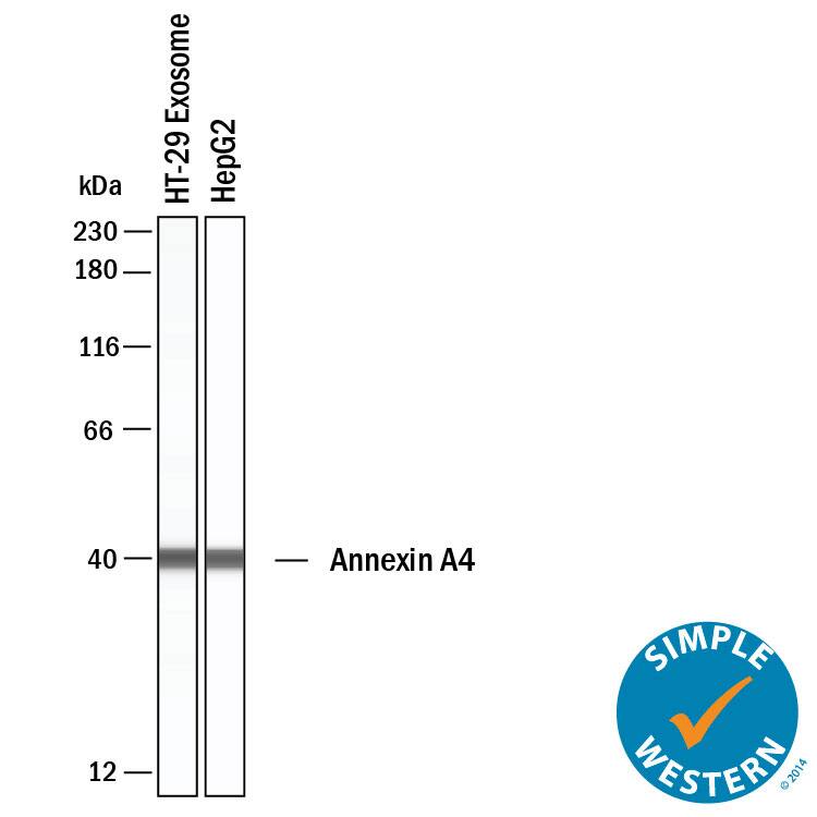 Western blot shows lysates of HepG2 human hepatocellular carcinoma cell line, NIH-3T3 mouse embryonic fibroblast cell line, and Rat-2 rat embryonic fibroblast cell line. PVDF membrane was probed with 1 µg/mL of Human/Mouse/Rat Annexin A4 Antigen Affinity-purified Polyclonal Antibody (Catalog # AF4146) followed by HRP-conjugated Anti-Goat IgG Secondary Antibody (Catalog # HAF017). A specific band was detected for Annexin A4 at approximately 36 kDa (as indicated). This experiment was conducted under reducing conditions and using Immunoblot Buffer Group 2.Detection of Human Annexin A4 by Simple WesternTM.